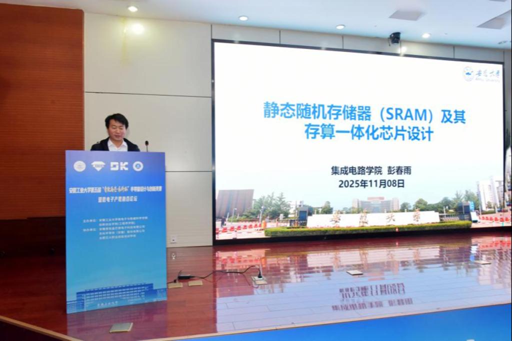 论坛报告环节,尹勇生教授、彭春雨副教授、高小芳博士、黄博同博士、黎绍鑫工程师分别作了题为《A/D转换器新机理及数字增强技术研究》《静态随机存储器及其存算一体化芯片设计》《芯粒互连技术介绍》《2025年中国集成电路产业链人才就业需求现状分析》《集成电路前世今生》的报告。